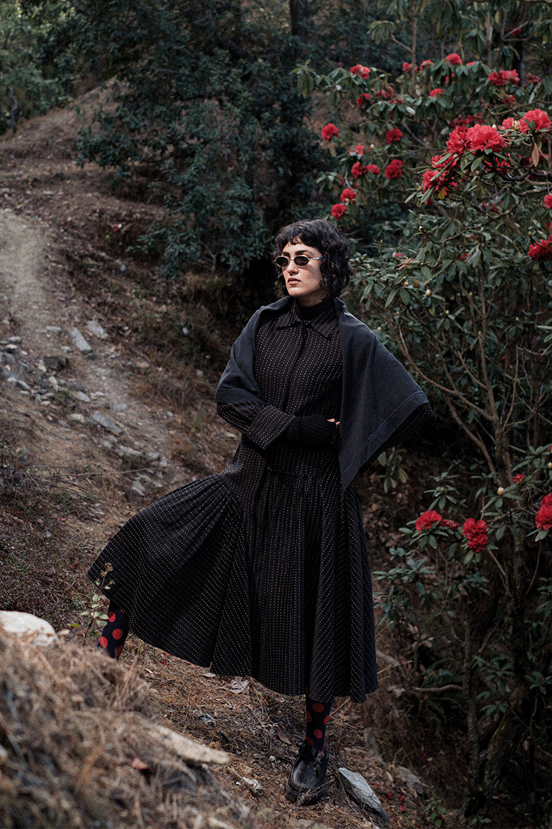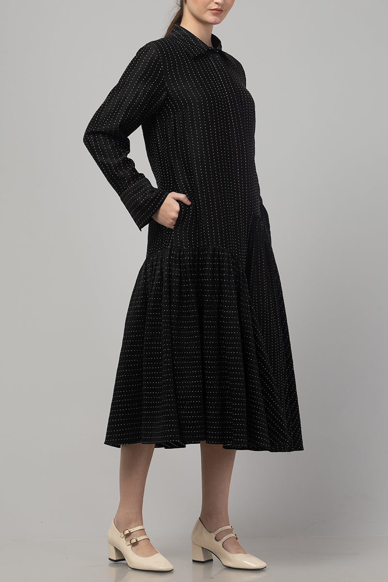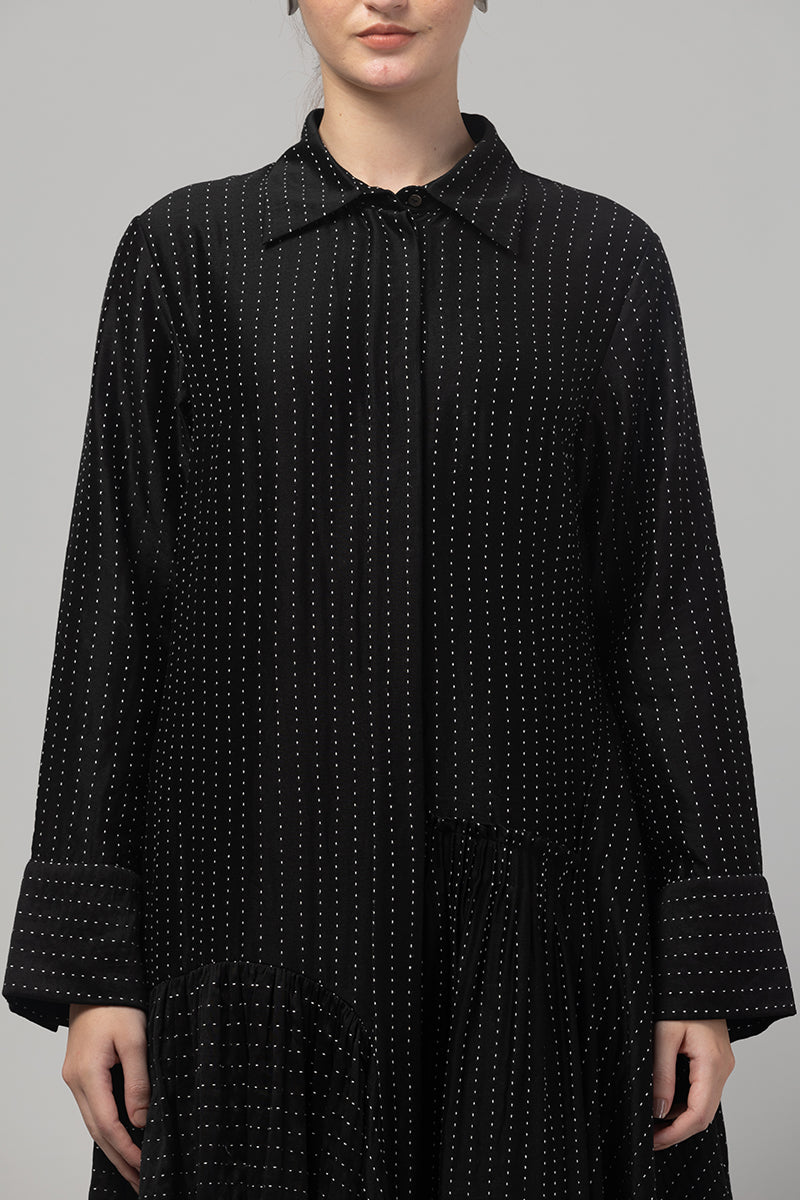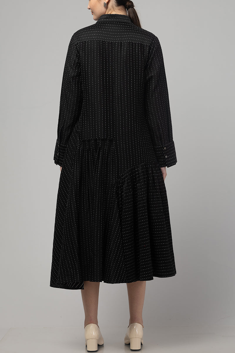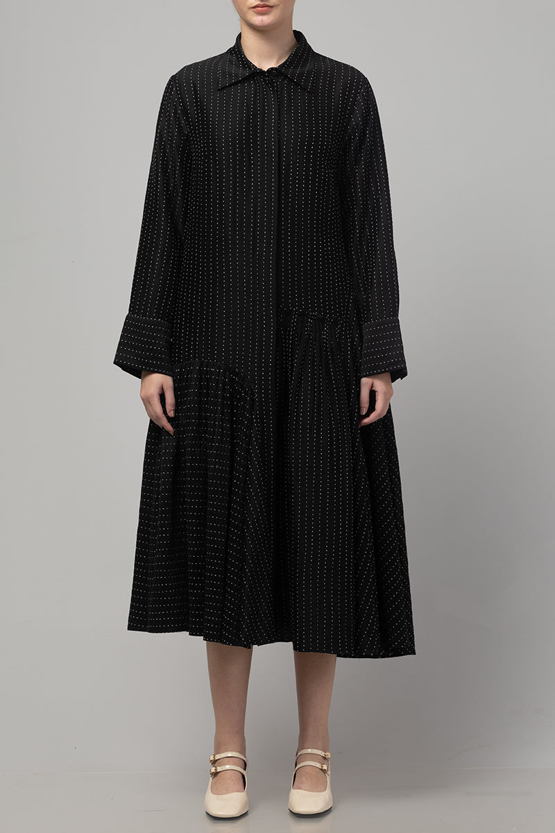 Embrace understated sophistication with this striking shirt dress. Featuring a refined collar and gracefully paneled skirt, the design marries tailored precision with flowing elegance. Delicate pintucks and strategic gathering at the sides create dimensional volume while maintaining a balanced silhouette.